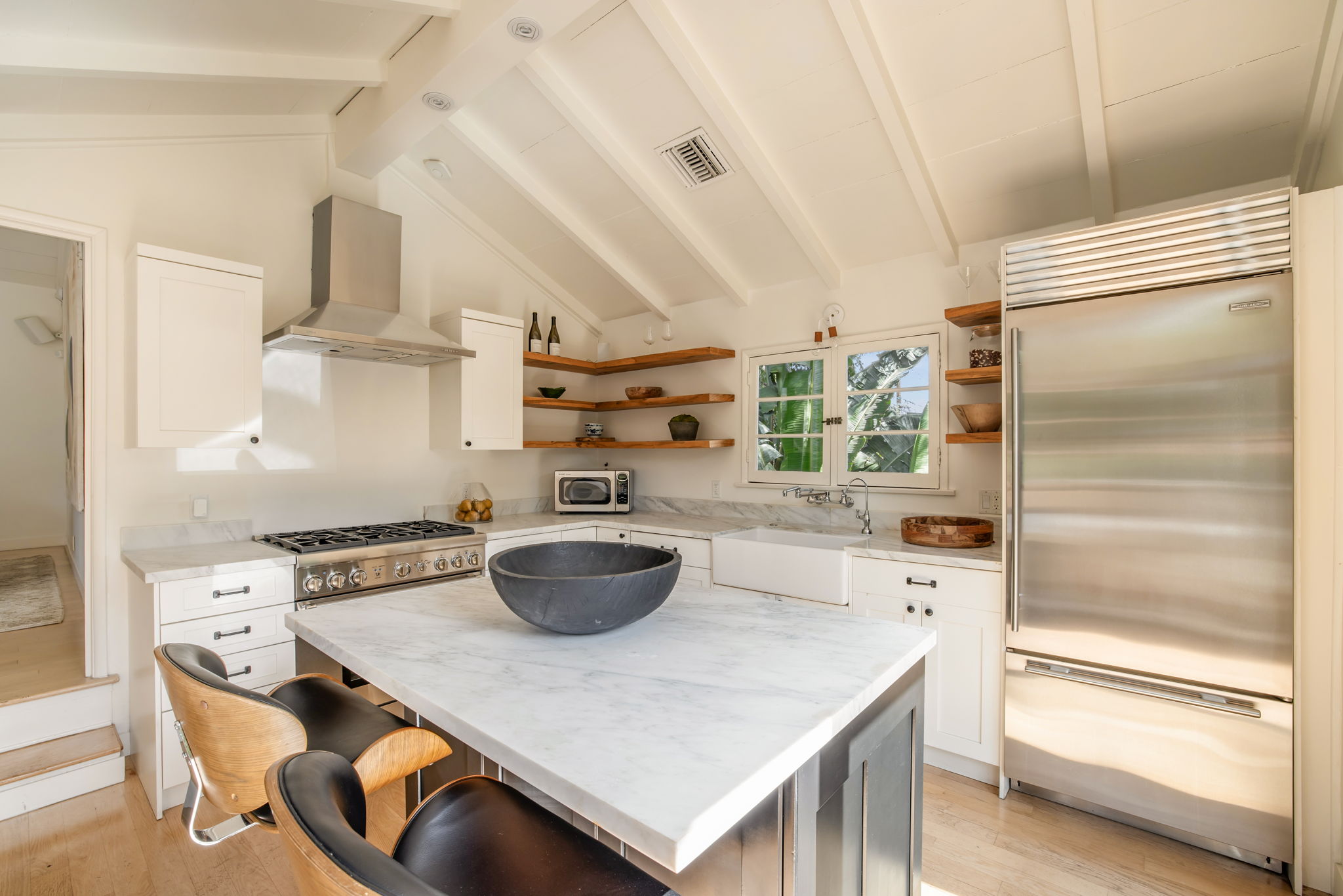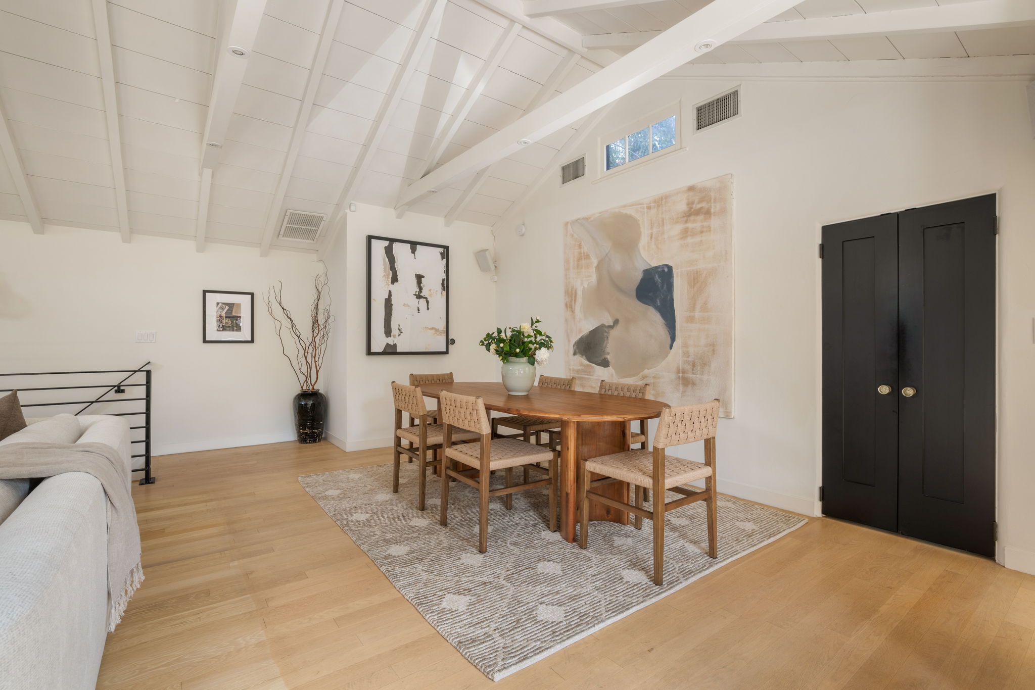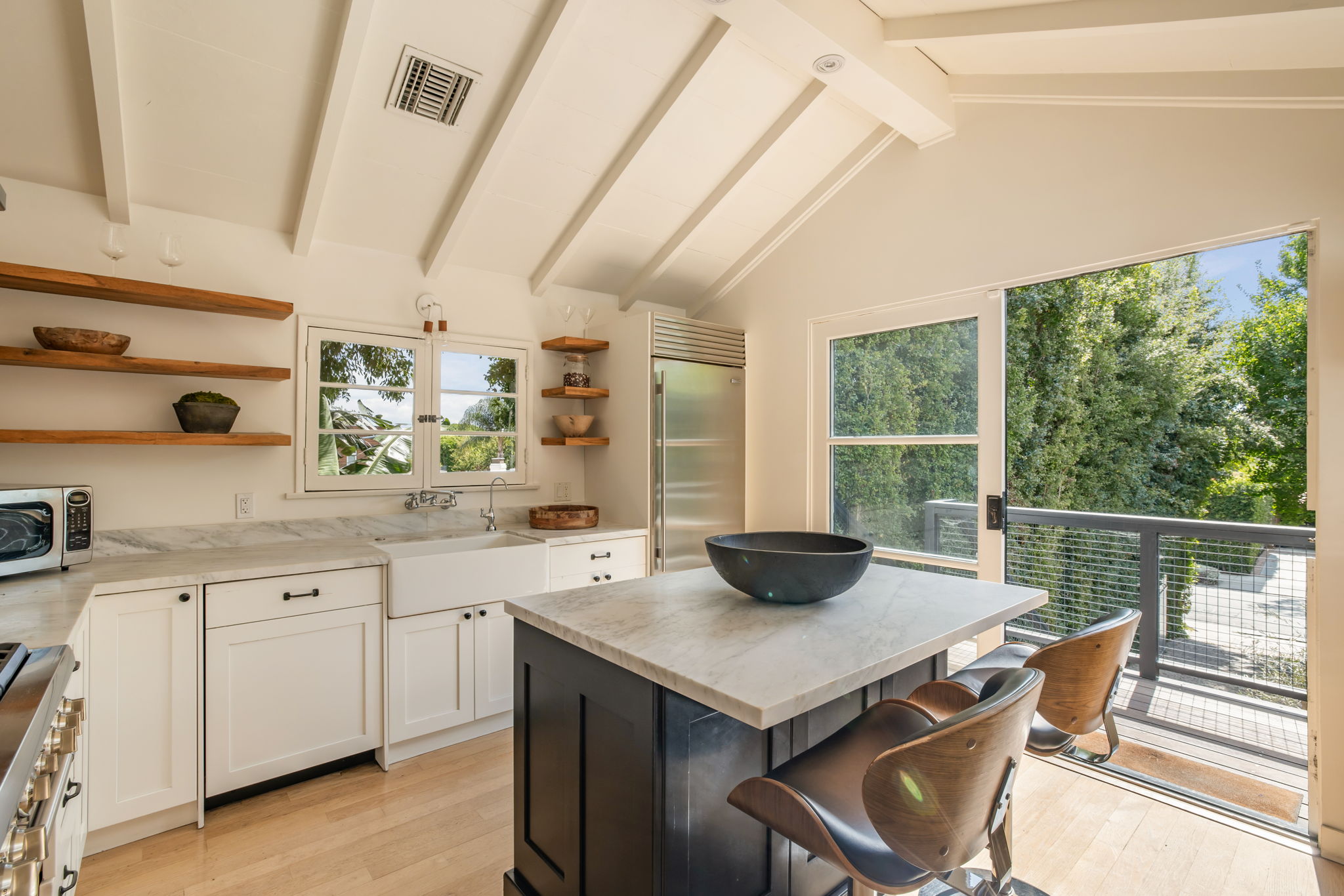 The elegant downstairs includes a serene primary suite with a beautifully appointed bath and walk in closet. Also downstairs, a romantic library/game room, full bath and secondary bedroom.Ascend the stairs to the upper level where sunlit vaulted beam ceilings create a loft-like vibe with generous living and dining spaces that flow effortlessly into a designer chef’s kitchen outfitted with Sub-Zero and premium stainless appliances. A third bedroom with full bath—currently used as a home office—completes the upper level. Off the living room, a large wood deck creates the perfect outdoor lounge or dining area ideal for entertaining or relaxing.