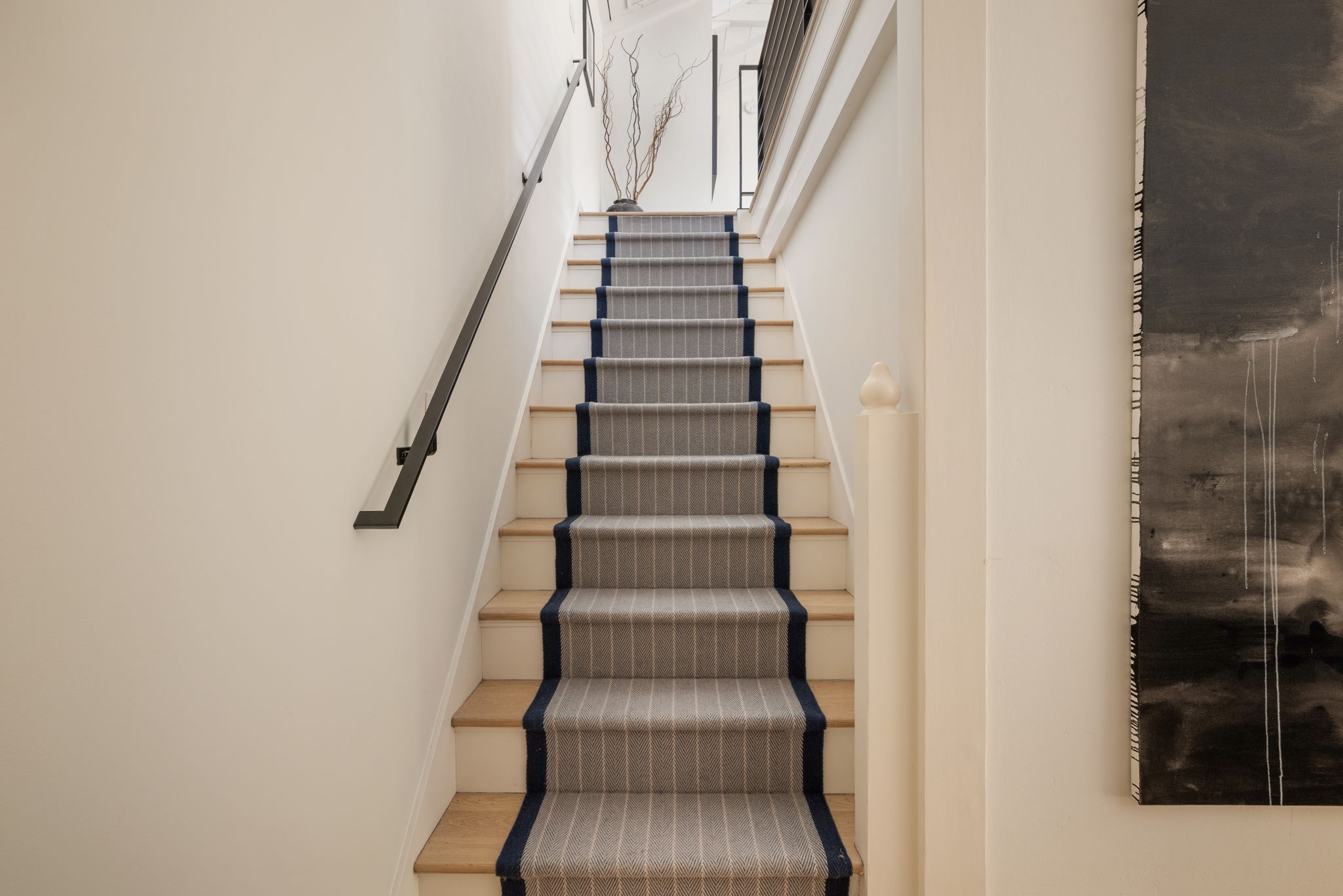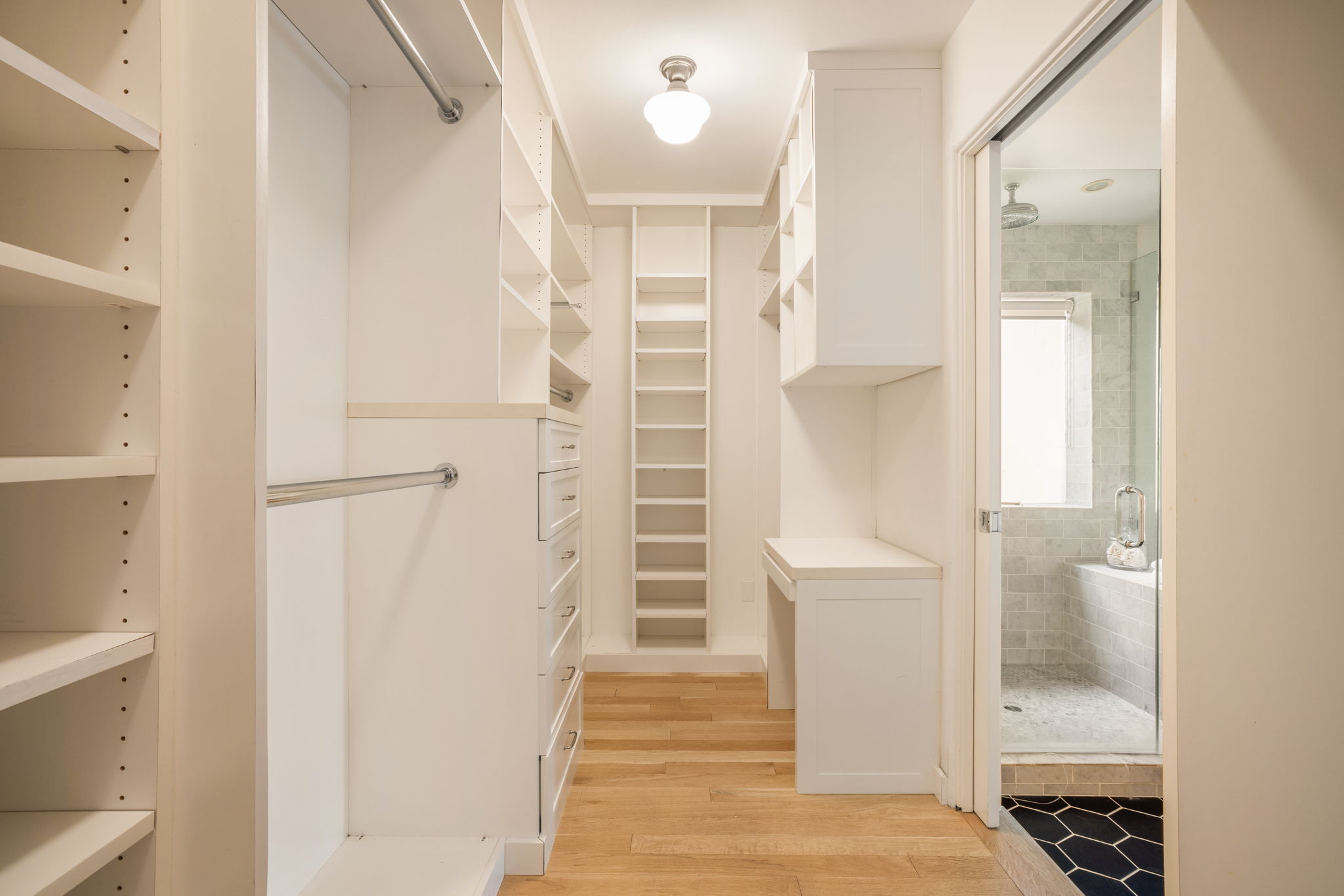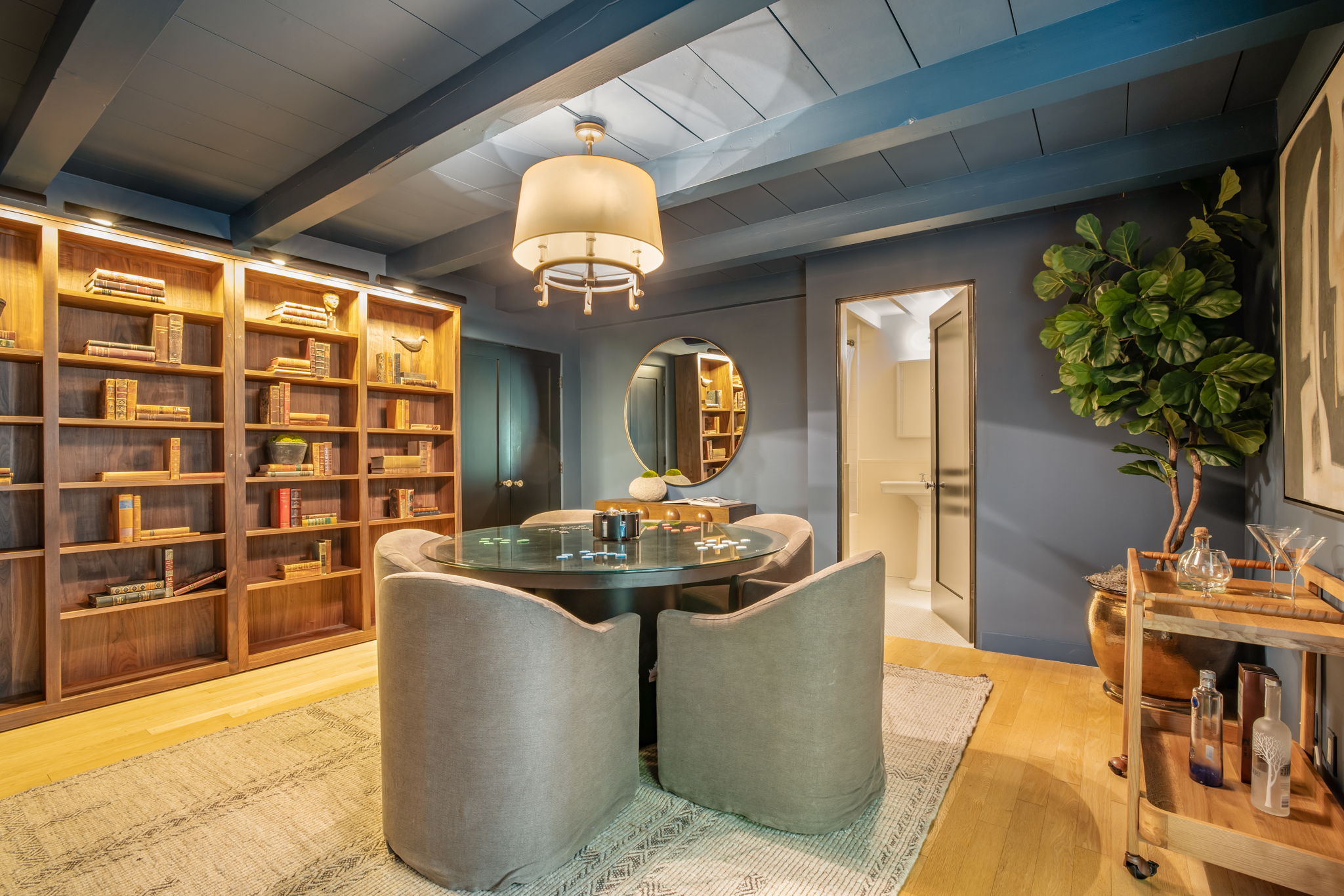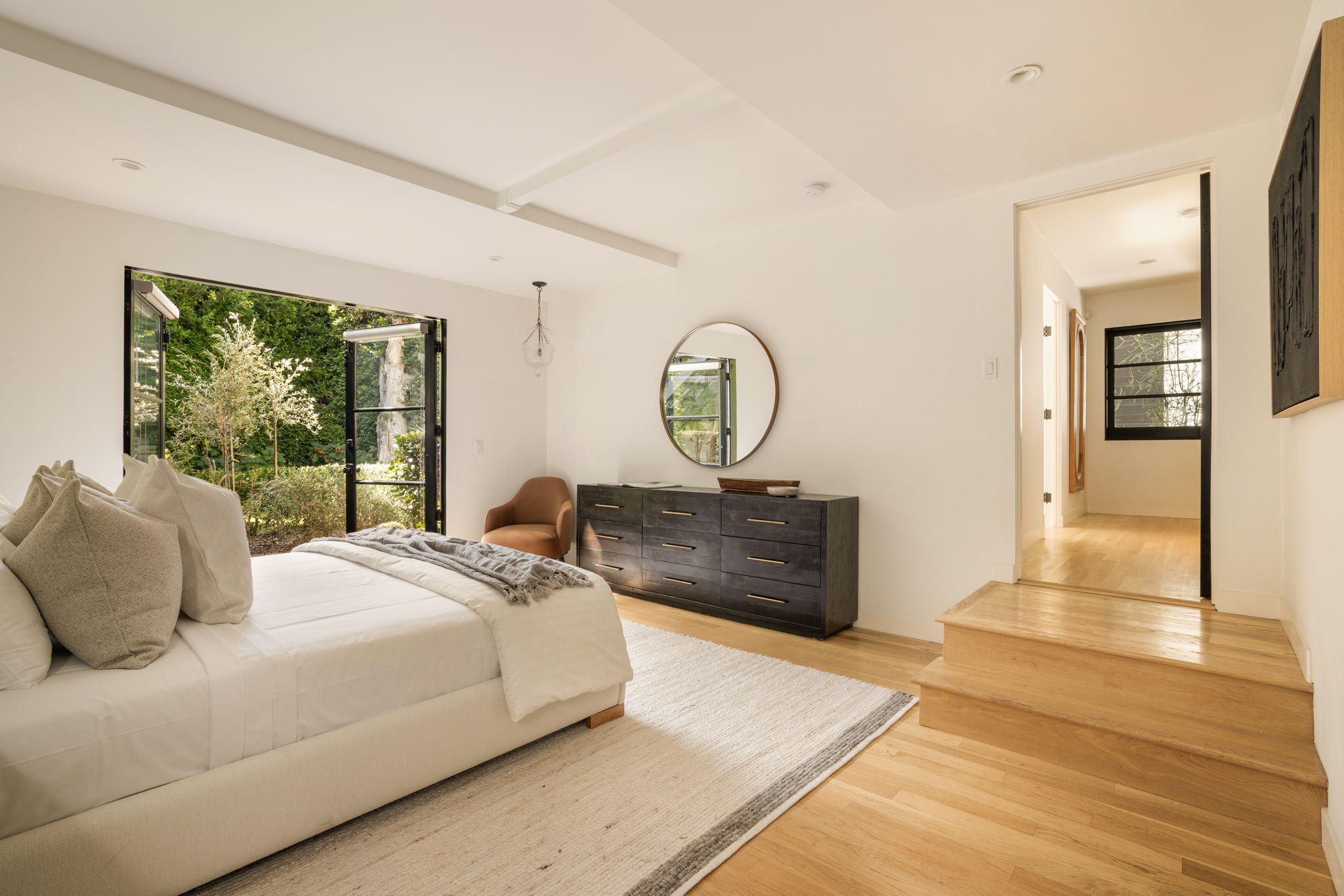The elegant downstairs includes a serene primary suite with a beautifully appointed bath and walk in closet. Also downstairs, a romantic library/game room, full bath and secondary bedroom.Ascend the stairs to the upper level where sunlit vaulted beam ceilings create a loft-like vibe with generous living and dining spaces that flow effortlessly into a designer chef’s kitchen outfitted with Sub-Zero and premium stainless appliances. A third bedroom with full bath—currently used as a home office—completes the upper level. Off the living room, a large wood deck creates the perfect outdoor lounge or dining area ideal for entertaining or relaxing.